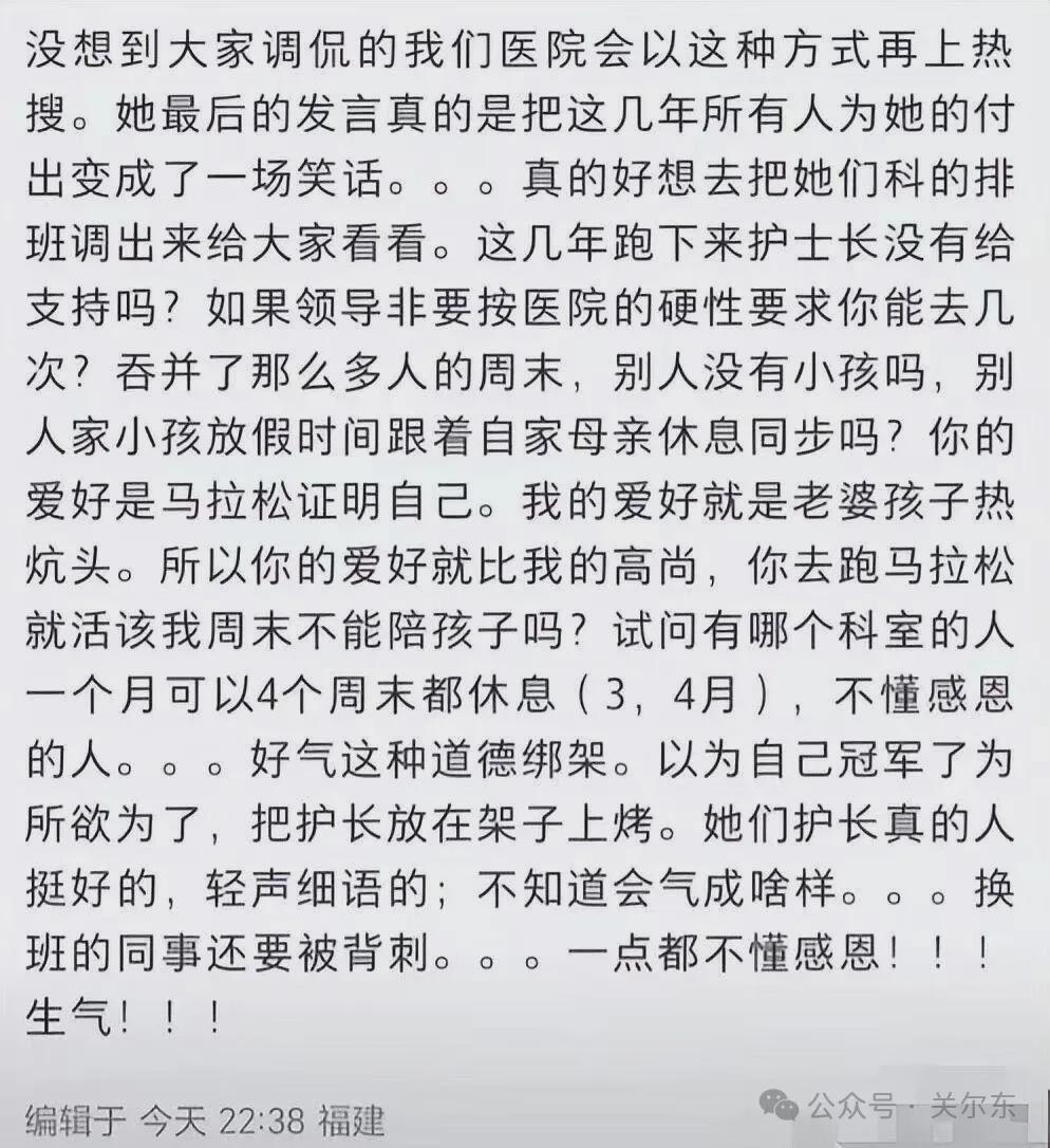 这引起了很多人的不满,包括张护士的同事。事实上,医院那边已经很照顾她的爱好了,参加马拉松每年有那么多的场次,平时也要备赛,不搭上很多的准备时间,是根本不可能出成绩的。
